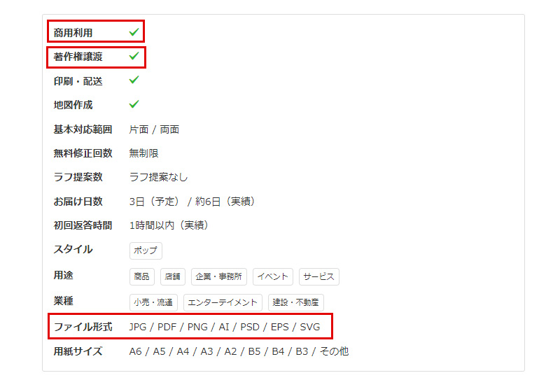 そして、特に確認しておきたいのは「商用利用」「著作権譲渡」と「ファイル形式」です。